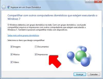 2. Para compartilhar impressoras, basta marcar a opção Impressoras, na lista de itens franqueados ao grupo doméstico. Isso significa que as impressoras diretamente ligadas a este micro poderão ser usadas pelos outros micros do grupo.