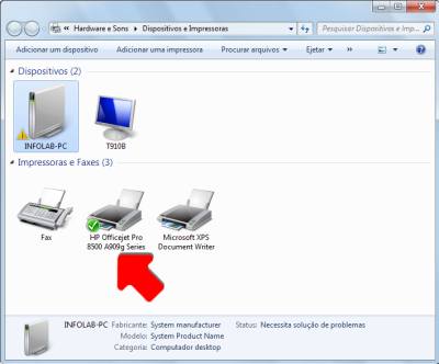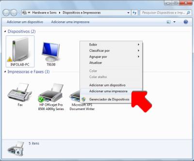 3. Se a impressora foi indicada para compartilhamento no grupo doméstico, ela deve aparecer quando você clica na opção Dispositivos e Impressoras, no menu Iniciar.